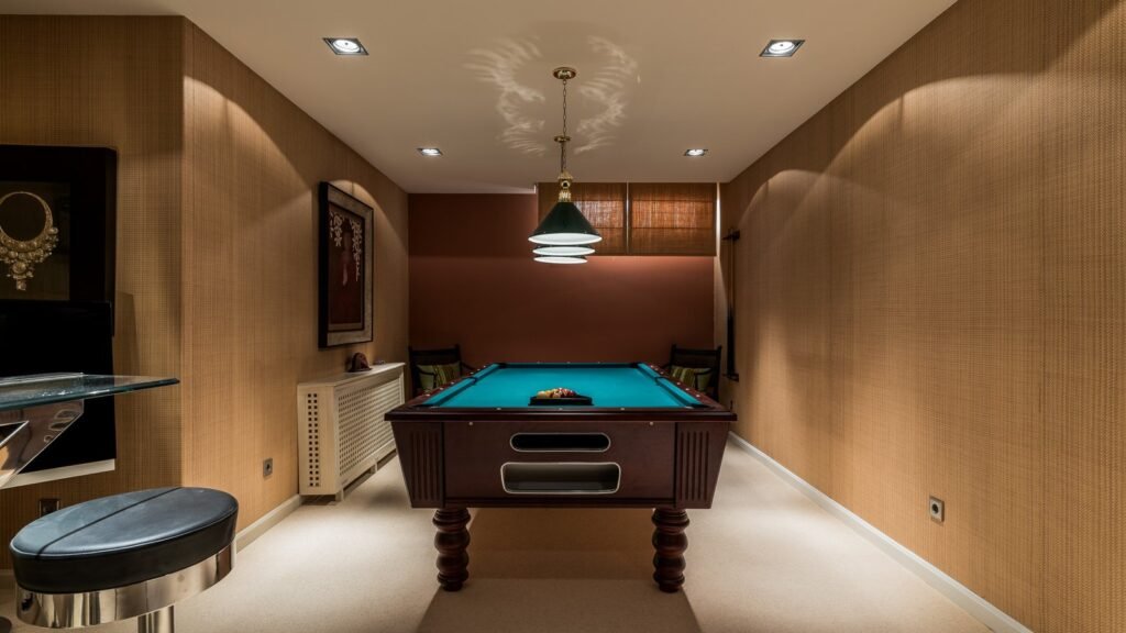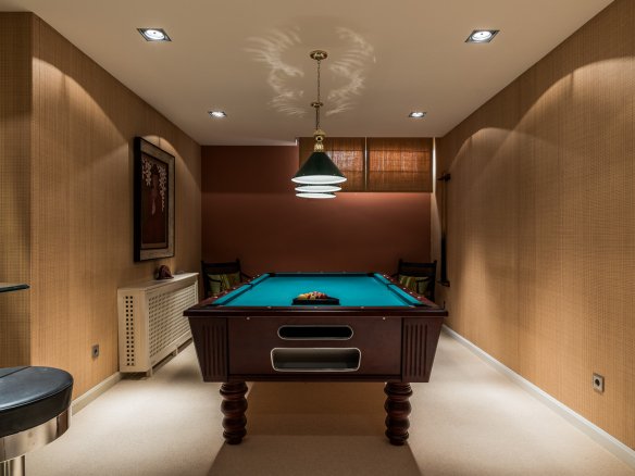 equipped with a pool table, bar and a projector, a laundry room, ample storage and staff